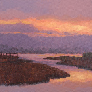 Above is a close-up. I felt like a conductor leading a sympthony, using a whole handful of brushes and letting the strokes swoosh like the motion of the wind--not doing too much blending, because it would muddy the paint. But keeping it light and smooth, so the glow underneath would show through. Just enjoying the feeling of each stroke as the brush glided across the surface. Yeah, slurpy!